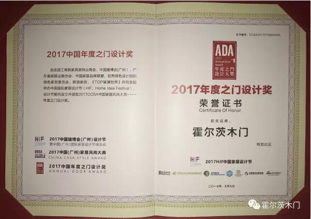 中國建博會(廣州)第二天,在2017中國家居風(fēng)尚大典CCSA 的活動現(xiàn)場 ,上演著一場中國頂級家居品牌進行跨界時尚傳播的盛宴。榮譽不斷,霍爾茨木門獲得2017年度之門設(shè)計獎!
