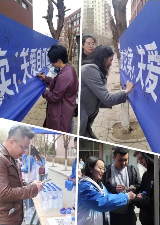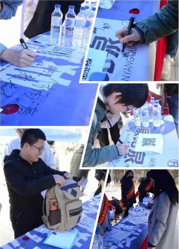 志愿者們通過科普宣傳的方式告知同學們關(guān)愛自閉癥兒童的重要性。同學們積極參與到義賣當中,用自己的實際行動親身參與到慈善活動當中,并在條幅上簽下自己的名字,留下自己獻出愛心的印記。