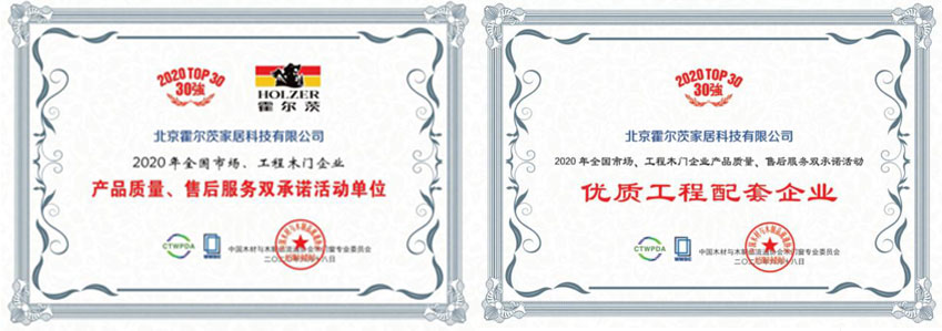 2020年6月18日,中國木材與木制品流通協(xié)會木門窗專業(yè)委員會年會上,憑借對產(chǎn)品的精益求精、服務(wù)標(biāo)準(zhǔn)的強(qiáng)有力執(zhí)行與貫徹、生態(tài)環(huán)保理念的深入發(fā)展等優(yōu)勢,北京霍爾茨家居科技有限公司再次榮獲“2020年全國市場、工程木門企業(yè)產(chǎn)品質(zhì)量、售后服務(wù)雙承諾活動單位”榮譽(yù)稱號,并依托自身完善的體系建設(shè)以及強(qiáng)大的技術(shù)支持,被授予“優(yōu)質(zhì)工程配套企業(yè)”榮譽(yù)。