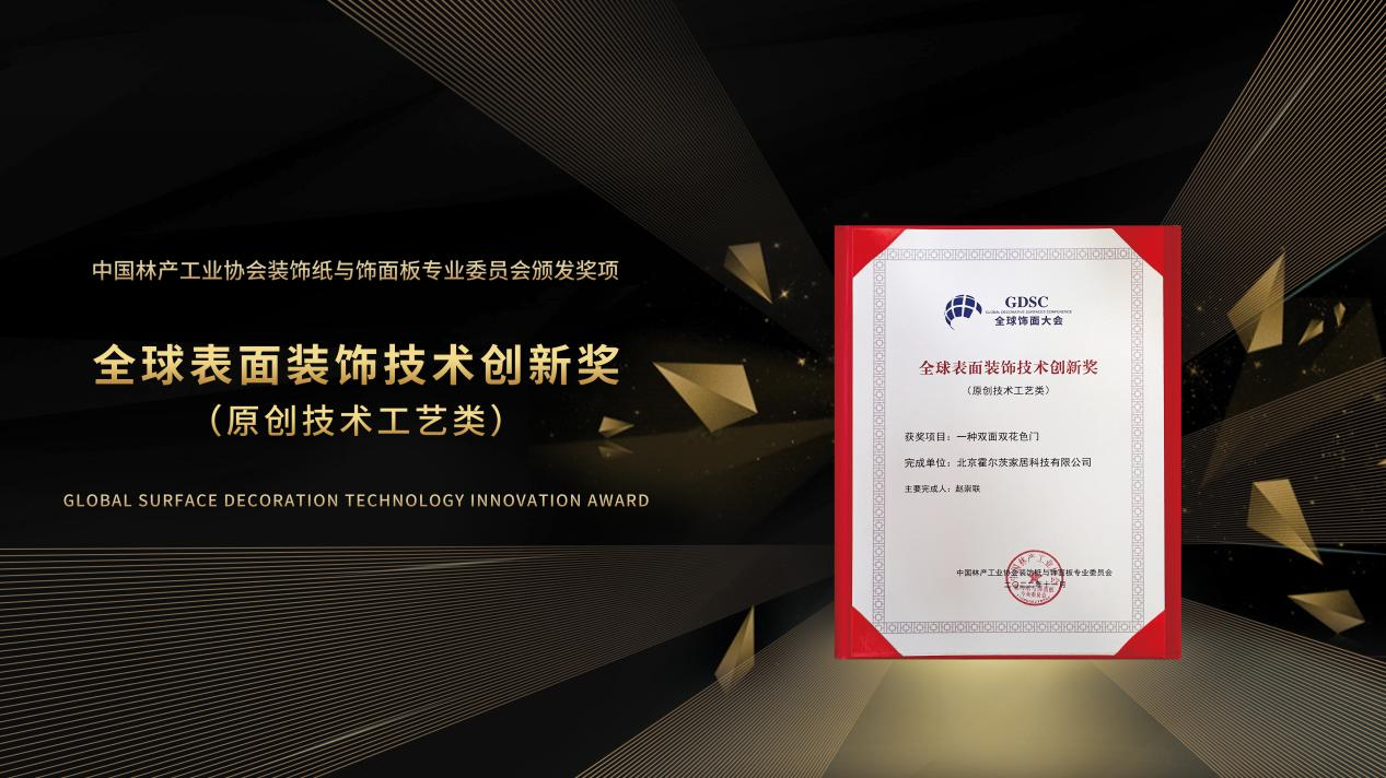 得益于CPL飾面材料的優(yōu)越性能,以及SAPPI離型觸感壓合技術(shù)的研發(fā),2022年11月,霍爾茨獲得了由中國(guó)林產(chǎn)工業(yè)協(xié)會(huì)與飾面板專業(yè)委員會(huì)頒發(fā)的“全球表面裝飾技術(shù)創(chuàng)新獎(jiǎng)”,帶來更進(jìn)一步的“色紋并美”空間體驗(yàn)。這一獎(jiǎng)項(xiàng)不僅彰顯了霍爾茨強(qiáng)大的研發(fā)力,以及不斷創(chuàng)新更迭產(chǎn)品以滿足消費(fèi)者更健康生活需求的銳意進(jìn)取精神,也為產(chǎn)業(yè)鏈的企業(yè)互通提供了優(yōu)質(zhì)的選擇樣本,進(jìn)一步推動(dòng)了木門行業(yè)的健康發(fā)展和創(chuàng)新發(fā)展。