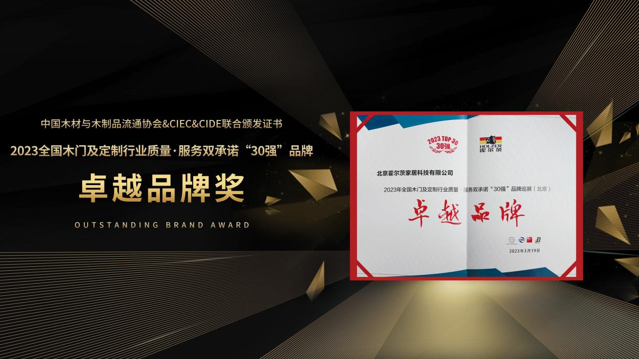 憑借企業(yè)綜合實(shí)力,霍爾茨榮獲由中國(guó)木材與木制品流通協(xié)會(huì)&CIEC&CIDE聯(lián)合頒發(fā)的2023全國(guó)木門及定制行業(yè)質(zhì)量·服務(wù)雙承諾“30強(qiáng)”品牌——卓越品牌獎(jiǎng),是在連續(xù)18年獲得全國(guó)市場(chǎng)、工程木門企業(yè)產(chǎn)品、質(zhì)量售后服務(wù)雙承諾活動(dòng)單位即木門行業(yè)30強(qiáng)獎(jiǎng)項(xiàng)后的又一有力證明。
