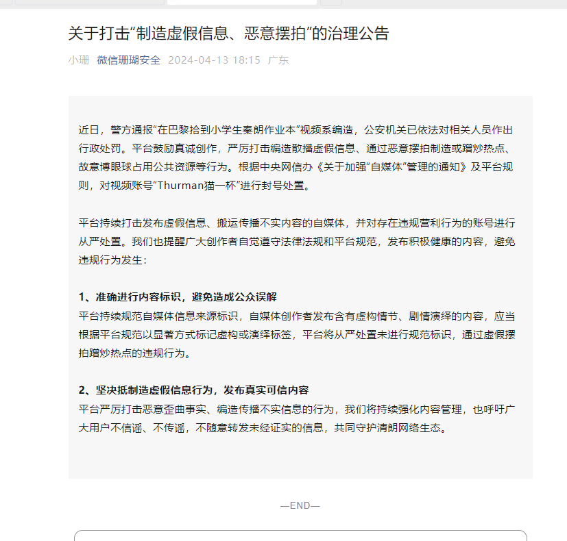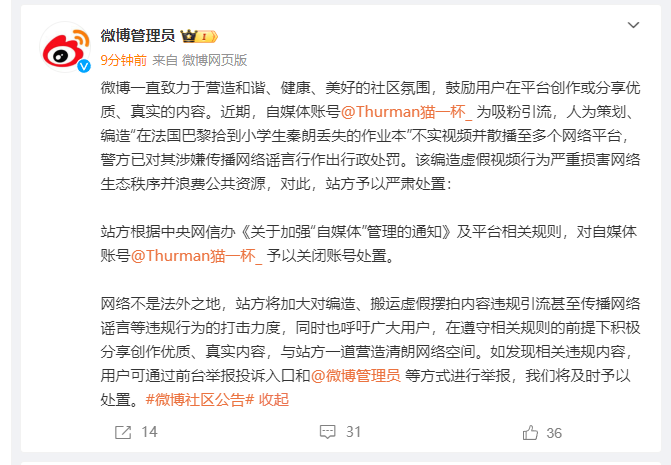微博一直致力于營造和諧、健康、美好的社區(qū)氛圍,鼓勵用戶在平臺創(chuàng)作或分享優(yōu)質(zhì)、真實的內(nèi)容。近期,自媒體賬號@Thurman貓一杯_ 為吸粉引流,人為策劃、編造“在法國巴黎拾到小學生秦朗丟失的作業(yè)本”不實視頻并散播至多個網(wǎng)絡平臺,警方已對其涉嫌傳播網(wǎng)絡謠言行作出行政處罰。該編造虛假視頻行為嚴重損害網(wǎng)絡生態(tài)秩序并浪費公共資源,對此,站方予以嚴肅處置:
