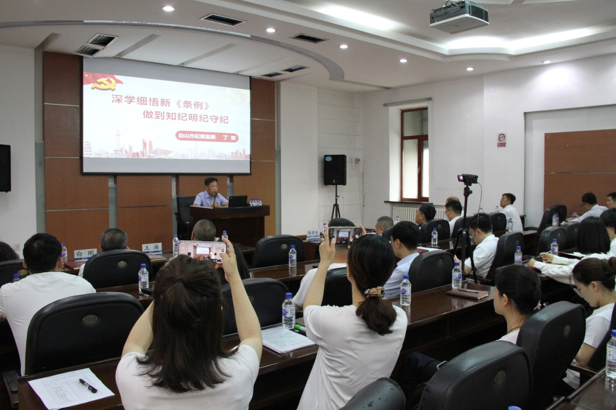 專題會(huì)特邀白山市紀(jì)委常委、監(jiān)委委員丁哲,以《深學(xué)細(xì)悟新〈條例〉、做到知紀(jì)明紀(jì)守紀(jì)》為主題,從深刻領(lǐng)會(huì)《條例》的重大意義、準(zhǔn)確把握《條例》的主旨要義以及對(duì)《條例》新增調(diào)整內(nèi)容的重點(diǎn)解讀等方面進(jìn)行了全面透徹、深入淺出的講解。同時(shí),結(jié)合國有上市公司特點(diǎn),用大量經(jīng)典鮮活的實(shí)際案例為參訓(xùn)人員開闊思維、答疑解惑,深刻詮釋了對(duì)應(yīng)條款的內(nèi)涵和外延,課程主題鮮明,既有理論高度又有生動(dòng)事例,既通俗易懂又緊貼實(shí)際,使參會(huì)的黨員領(lǐng)導(dǎo)干部醍醐灌頂、受益匪淺。