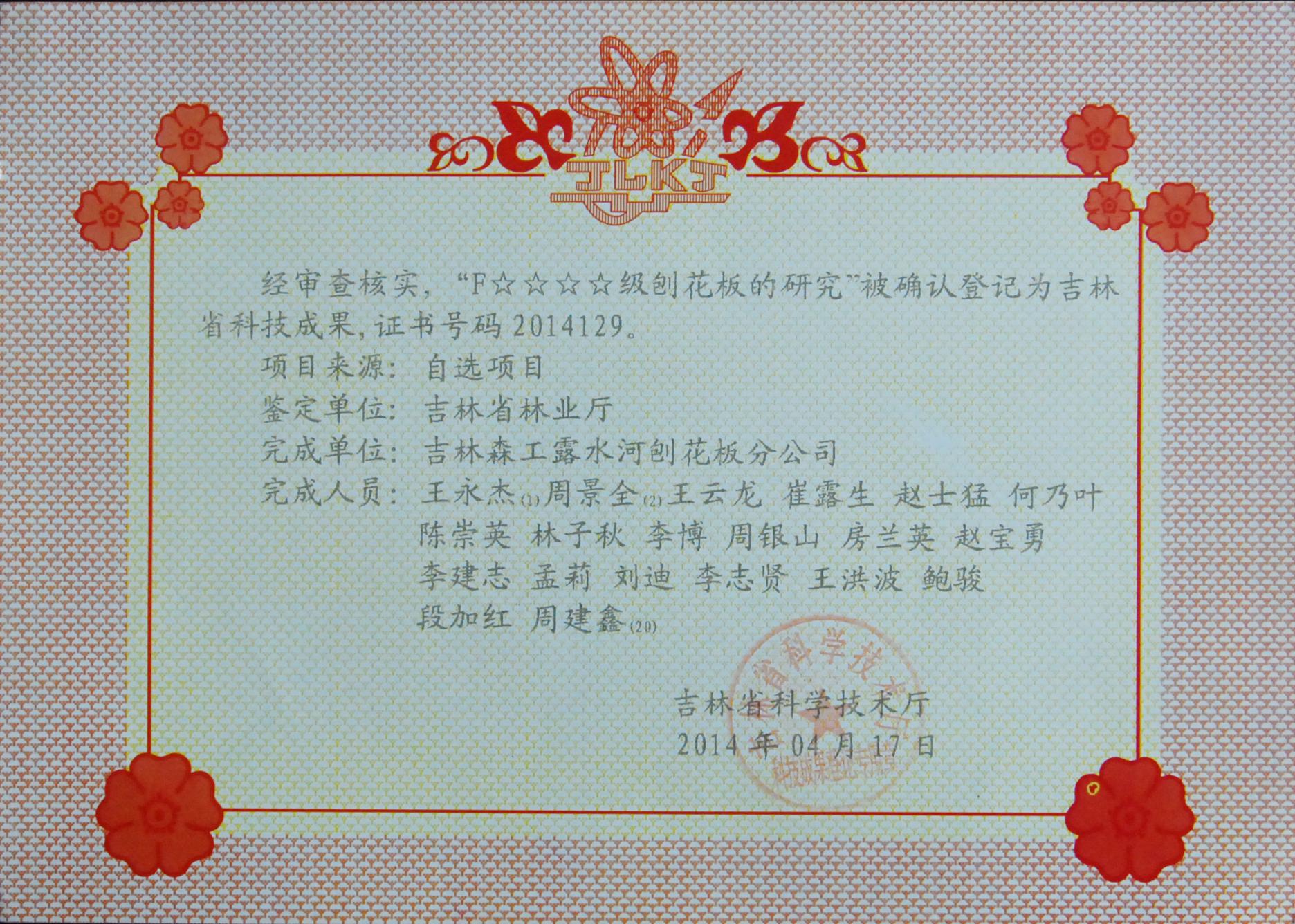 吉林森工露水河刨花板分公司“F☆☆☆☆級刨花板”科技成果證書